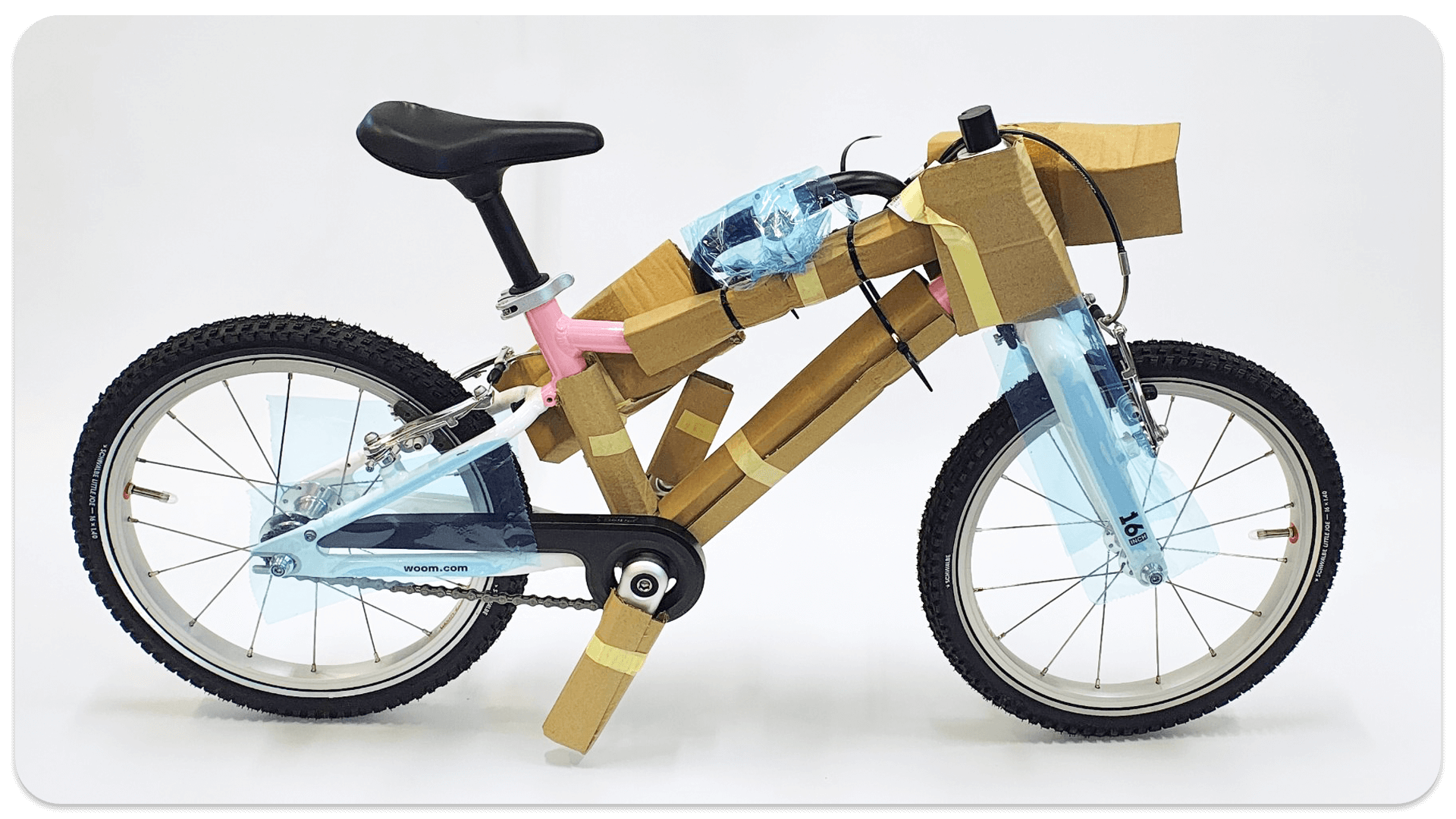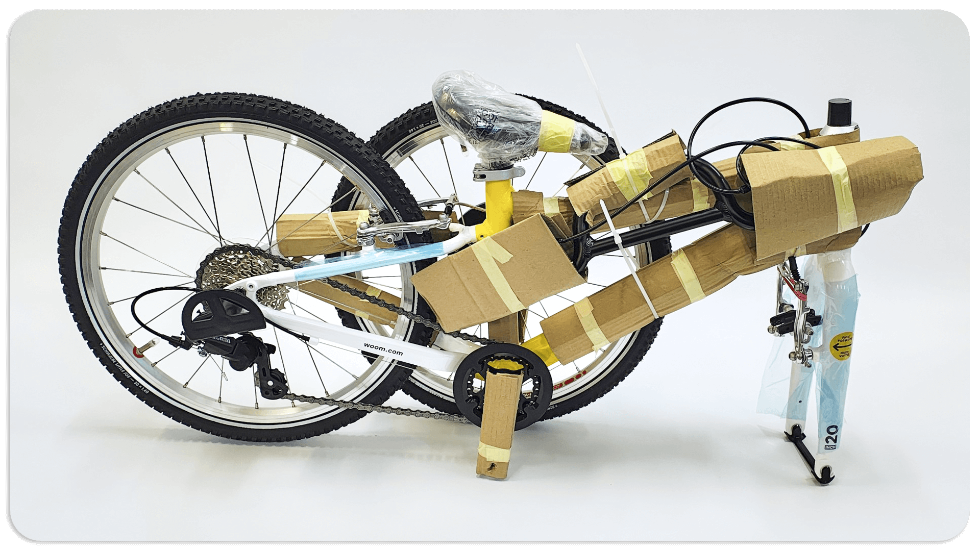 Rower należy umieścić w pudełku i dobrze zabezpieczyć na czas transportu. Luźne elementy takie jak kierownica i koła (dotyczy woom 4,5 i 6) należy spiąć do ramy, wcześniej zabezpieczając ją warstwą ochronną. Najlepiej do spięcia użyć opasek zaciskowych tzn. trytytki/zipa a do zabezpieczenia ramy można użyć kawałków tektury. Klucze, pedały należy umieścić w pudełku.