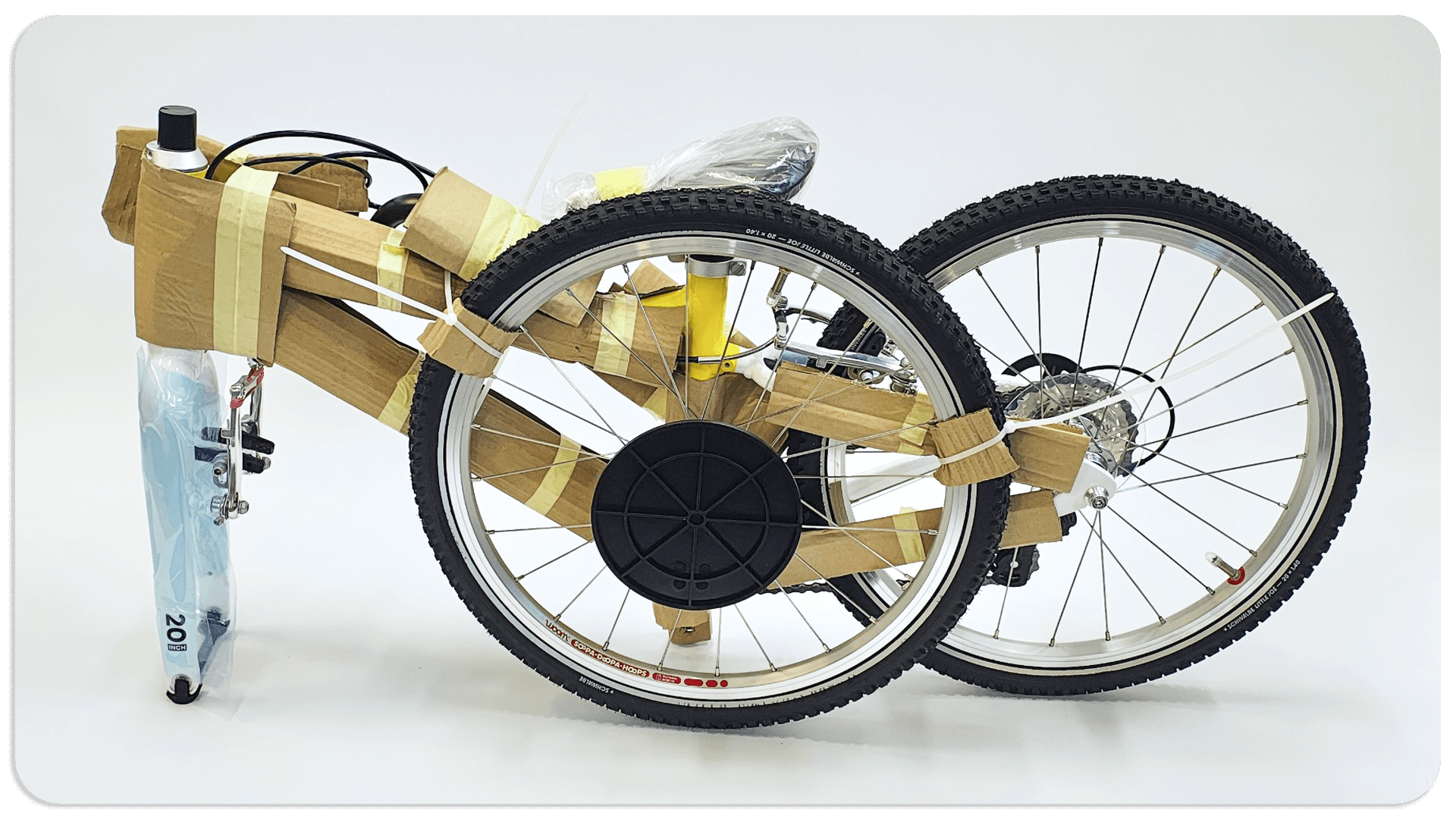 - Siodełko wyjęte z ramy, unieruchomione do tylnego koła, miejsce mocowania zabezpieczone kartonem,