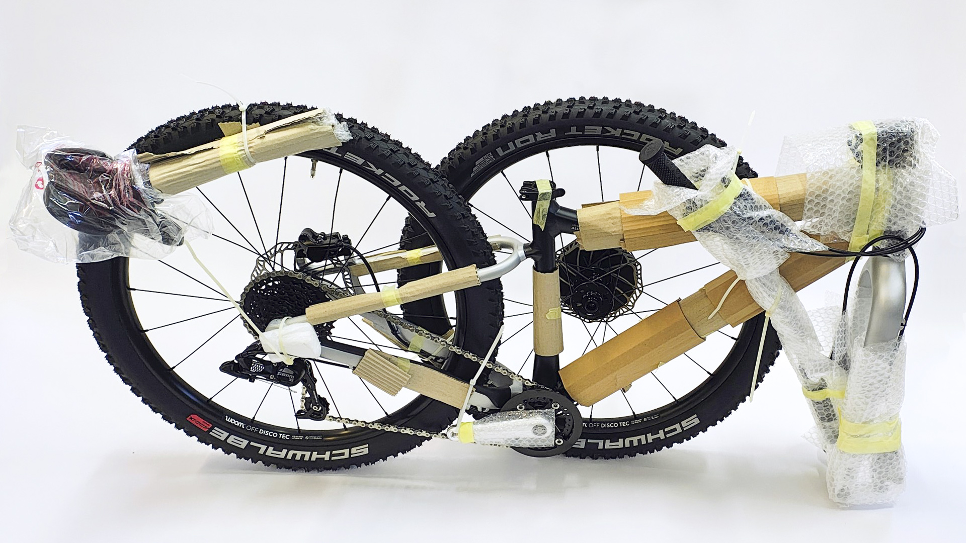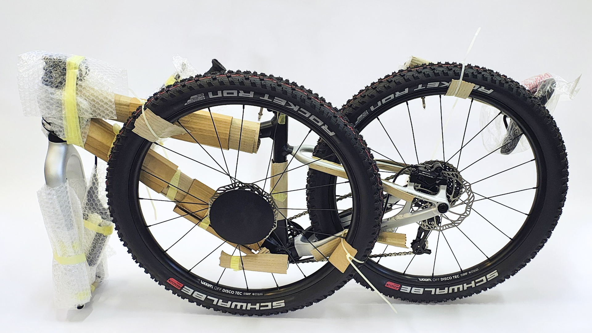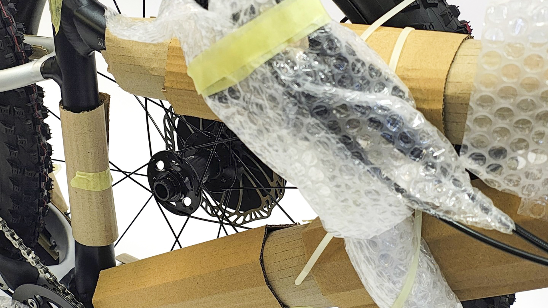 - Przednie koło zdemontowane, unieruchomione do ramy po lewej stronie roweru, do rury głównego i tylnego trójkąta, oś umiejscowiona w świetle głównego trójkąta, zabezpieczona plastikowymi zatyczkami, rama w miejscu styku z przednim kołem zabezpieczona kartonem, zabezpieczona korba wsunięta pomiędzy szprychy koła,